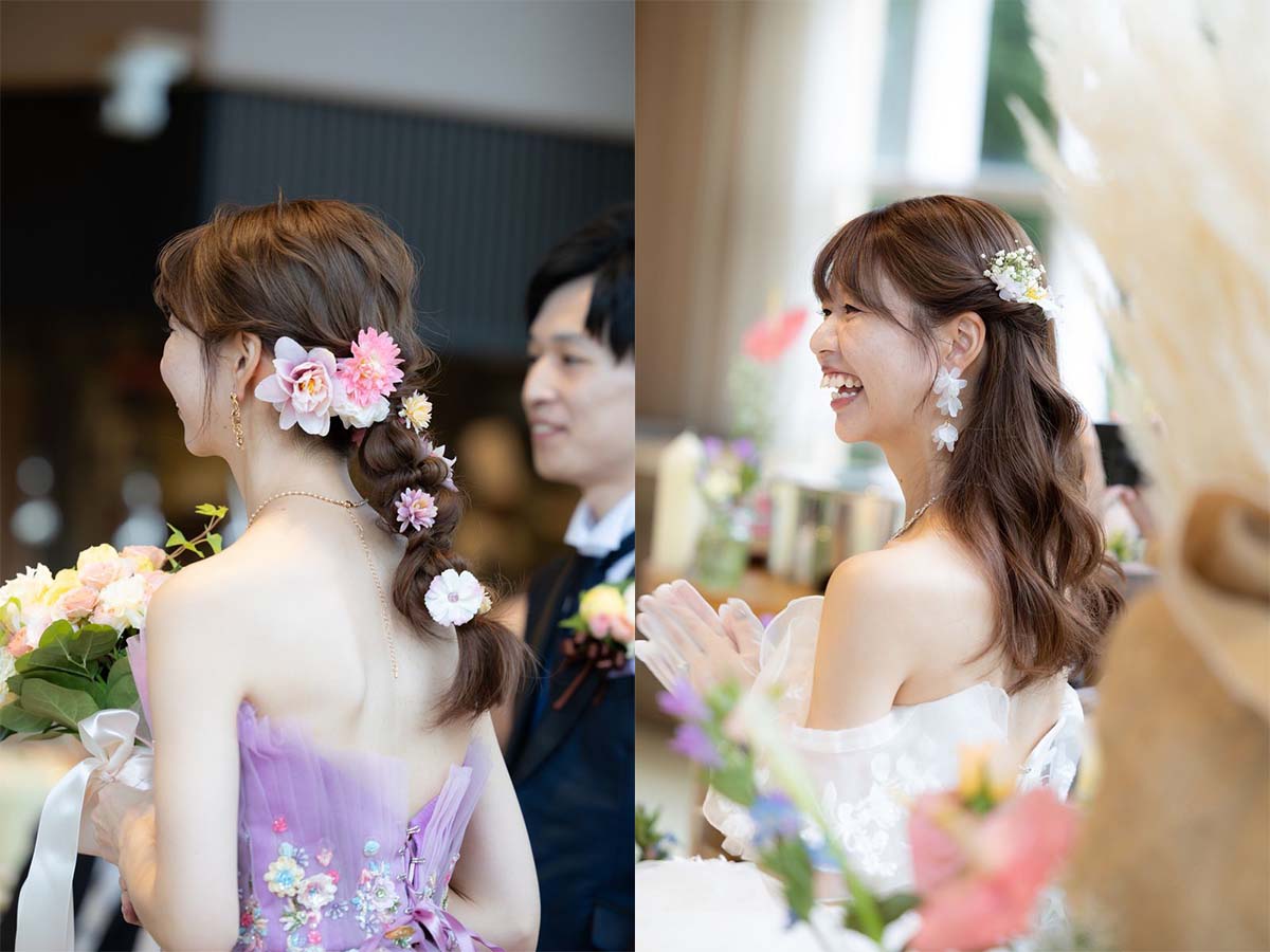披露宴はハーフツイン、カラードレスでは編みおろしヘアにチェンジ。アクセサリーも含めてトータルコーディネートし、統一感のある世界観を大切にしました。