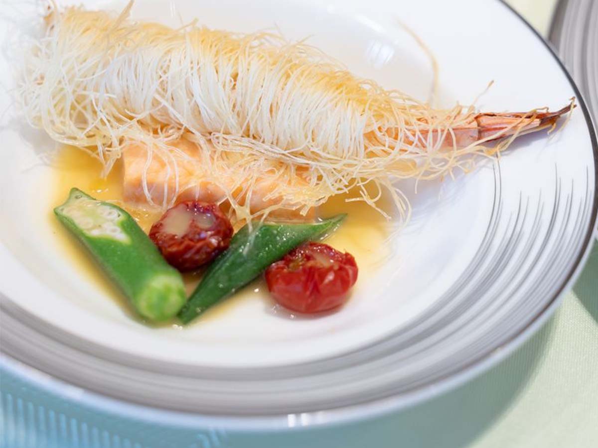 ふたりの大好物・エビを取り入れた特別メニュー。見た目も華やかで、味わいも印象的な一皿に。大切なゲストへ「好き」を共有するおもてなしです。