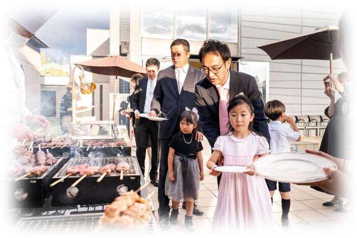 普通の結婚式とは違いお祭りみたいにしたいと思いました。 コースの料理以外に屋台ブースも作りました。 また、来ていただくゲストのみなさんがいかに楽しんでいってくれるかを考えました。