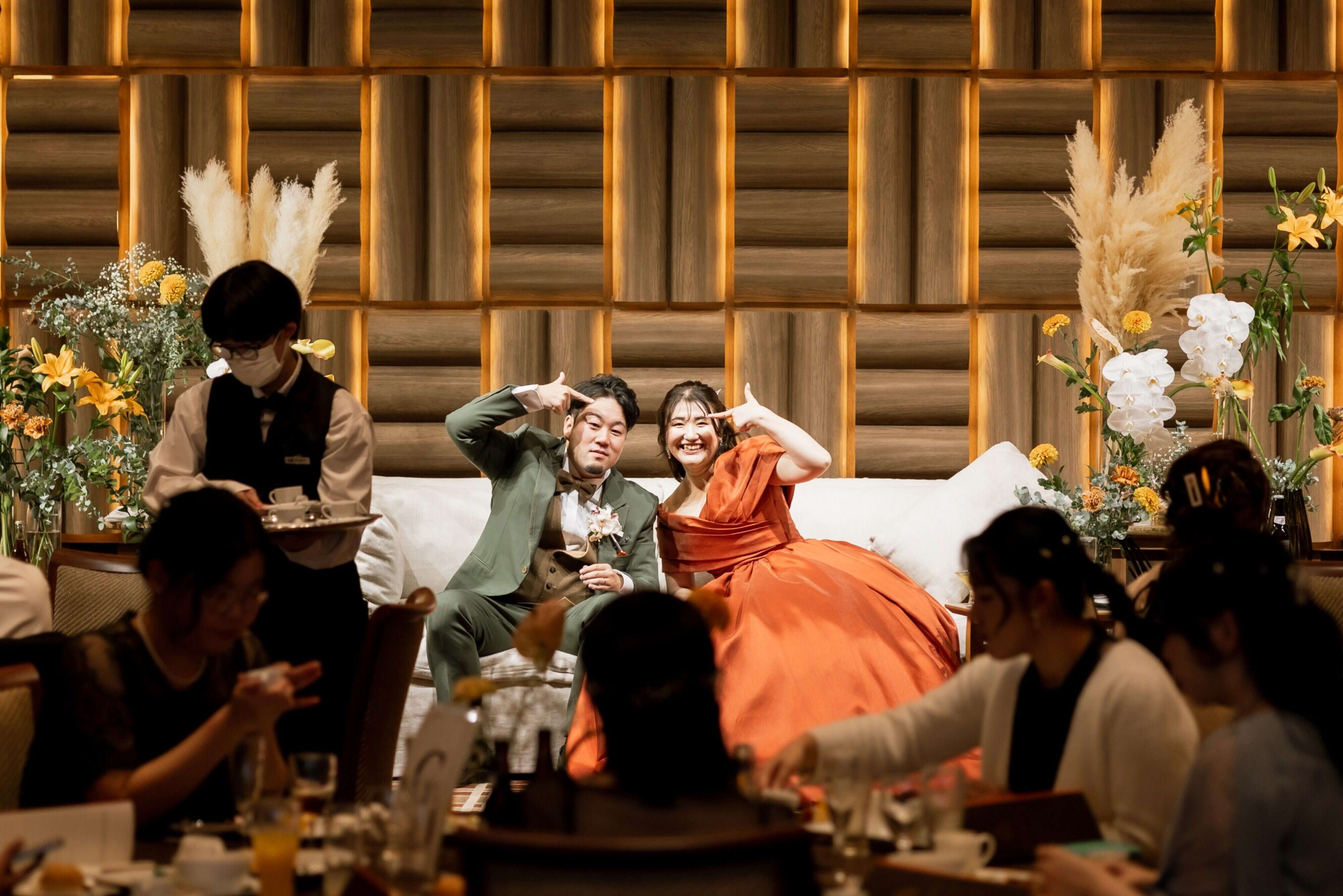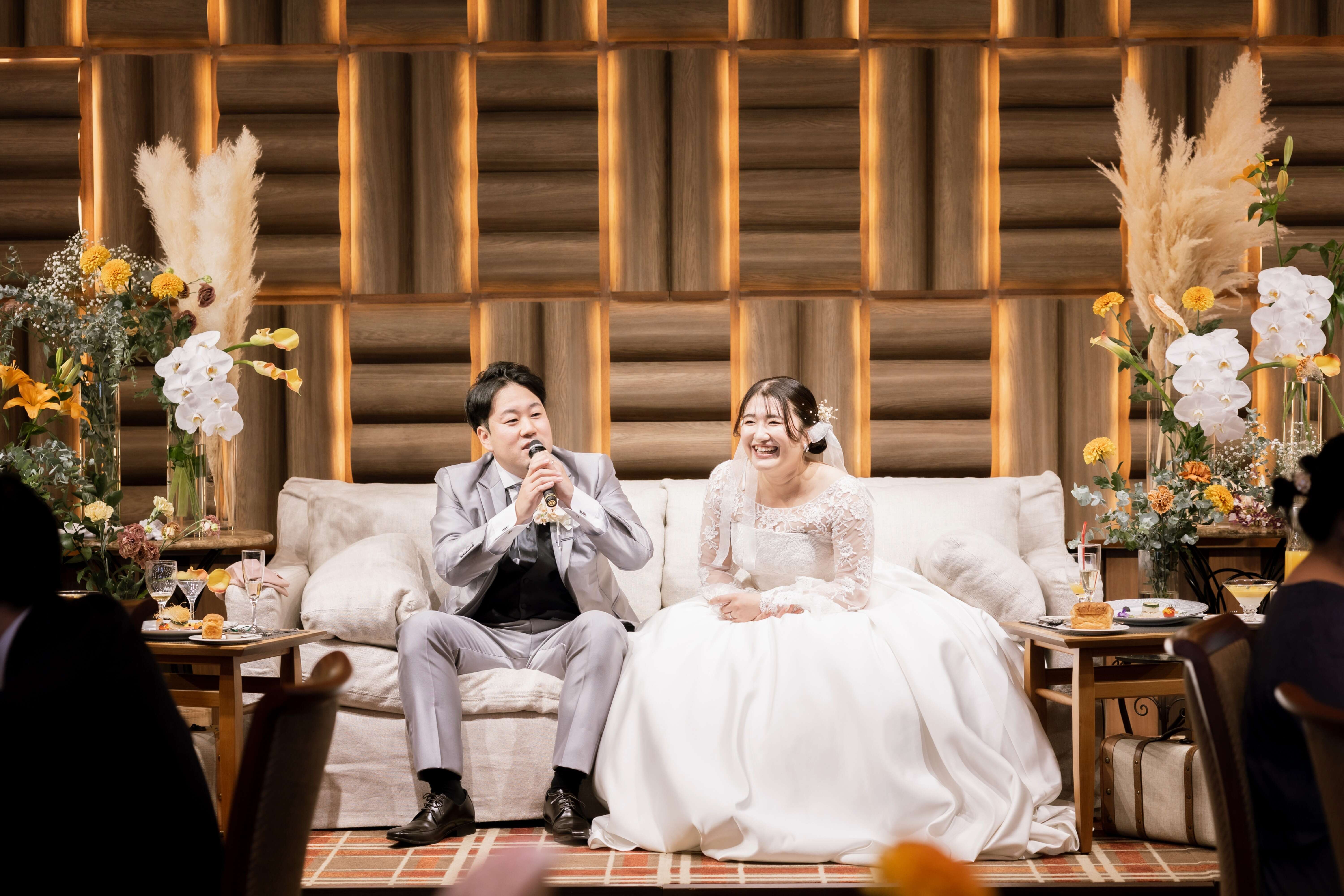 遠方からいらしてくれたゲストの方々が多かったため、なるべく写真撮影や歓談に時間を設けました。子ども連れのゲストの方も多かったので、キッズスペースは大活躍でした!子どもたちが退屈しないよう、お菓子セットや座って遊べるプレゼントを準備したのも良かったです。また、ソファ席にすることで、新婦のドレスをあますところなく見せびらかせました(笑)食事もわたしたちの希望に沿って変えてくれ、ゲストの方々も喜んでくれました!