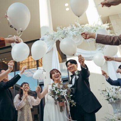 挙式後は光煌くプールガーデンにてみんなの笑顔と「おめでとう」の歓声の中、花びらが舞い降りるフラワーシャワーを受けて、幸せな空間が広がります。チャペル前の広場では、家族や友人との記念撮影やブーケトスなど、ウェルカムパーティーを行います。